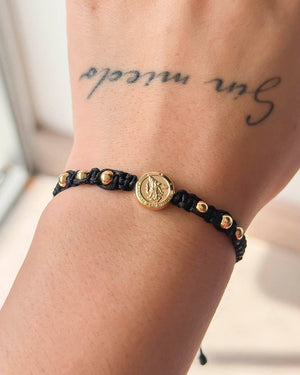 Pulsera negra con balines y dije san Miguel de oro laminado.