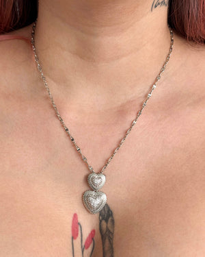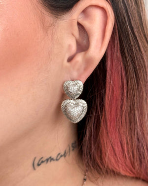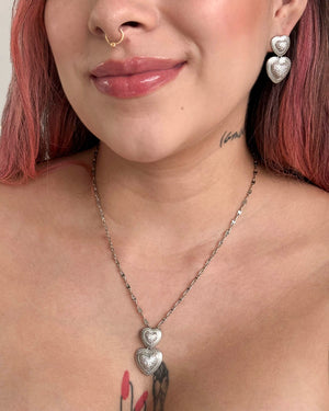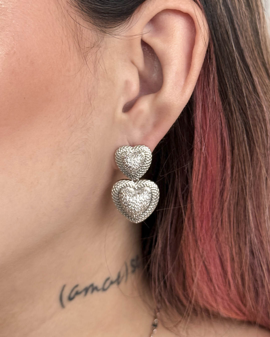 Set doble corazón plateado, tiene baño de rodio e incluye 1 unidad.